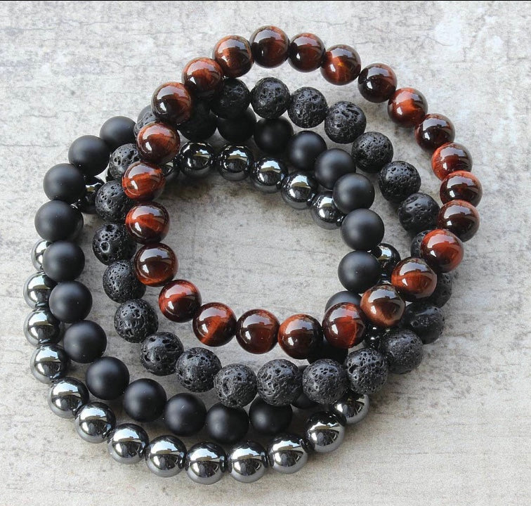 Tigers Eye, Hematite, Onyx & Lava Stone Bracelet Set